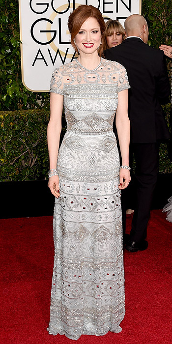 Ellie Kemper pulls off the sparkly patterned dress and red lip.