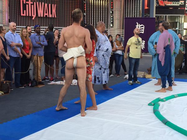 Sumo wrestlers sneak into the house and wake up all the men with a pretty aggress gong hit. JJ really wants to go on the Japanese date because he likes sushi. He’s obviously supes cultured. Once assembled, all the boys are wearing sumo diapers and need a whole lot of censorship, not unlike Jillian’s asshole last season. They do lunges in their thongs just so that Kaitlyn, a bunch of other dudes and a camera crew can size up the contestants’ junk hangin loosey goosey. (Joe’s in particular.) Tony runs his gentle hands through his mop top, pulls it into the babiest man bun I’ve ever seen, flicks his shades down and announces that a 600 lb man should be VERY AFRAID. T-Bone Tone slaps the fat man a bunch of times while everyone else points and laughs then MOOD SWING, Tony the healer must need a little more ginkgo because he is very sad. He tells Kaitlyn that every date is about aggression and he’s a lover even though he just played slap the man boob with that wrestler five minutes ago. Basically Tony acts like a whiny baby, which is ironic because he’s also wearing a diaper while he wah-wah’s. I stop listening as I usually do when Tony speaks, plus I was distracted by him tucking his hair behind his ears and hawking a loogey over the balcony while trying to win Kaitlyn over. Someone get Tony his bottle.