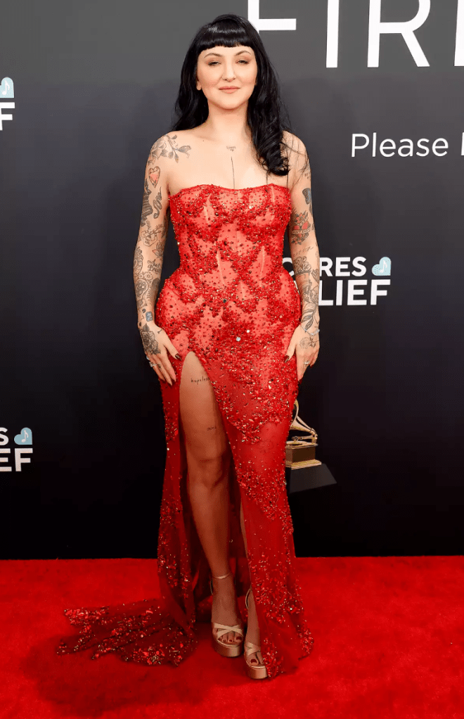 Not only did she coordinate cream jackets with her mans (and Noah Kahan) but she looks like a tall drink of Babe Soda. The red carpet commentator made sure to emphasize that this minidress is made of HARD plastic and that it was likely very uncomfortable. No shit! If my elastic waistband doesn’t touch the underside of my boobs, I’m uncomfortable. I could NEVER squeeze my body into this let alone walk a red carpet without busting through the legos or having a nip slip.