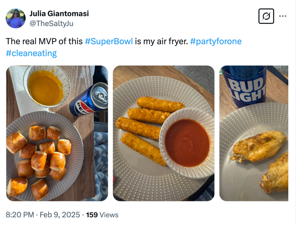 But not before I had my last hurrah of a bender via the Super Bowl. Couldn’t tell you one thing about the game itself, but I will always accept an excuse to app my face off for 3 hours.