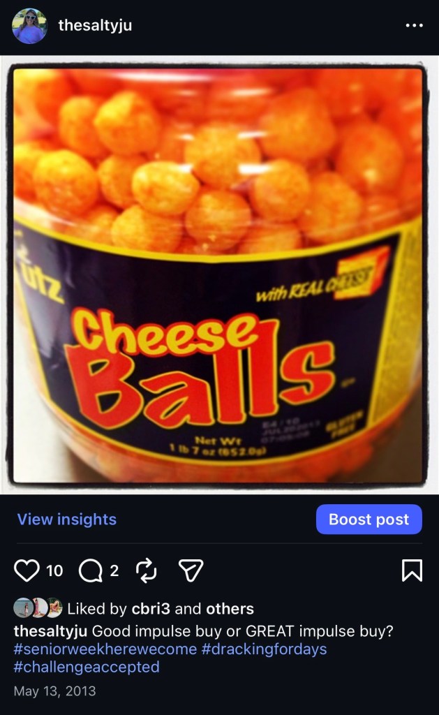 Every era of everyone’s lives deserves an anthem emphasizing just how young and fun they are. My Saratoga Nights era had “we ain’t ever getting older” and my college era had this epic singalong. It came out at the PERFECT time for me. Twas second semester of senior year, I was just starting to face the reality of getting a job after college and where I was going to live and if I could even afford to get my own apartment, which are all stressful things that (spoiler alert) I still deal with. And then this funky tune comes out that doesn’t sound like all the other songs and gives us the perfect reminder that just for right now, we’re still in a fake life bubble of no responsibilities and making memories with our friends. I can clearly remember scream singing TONIGHT WE ARE YOUNG at Darby’s. And guess what? It WAS true. I was young that night. I’m not anymore. Excuse me while I go sob over my tax return.