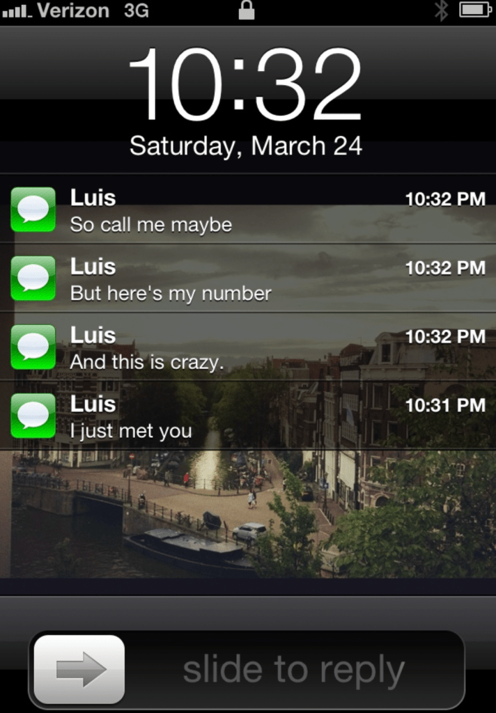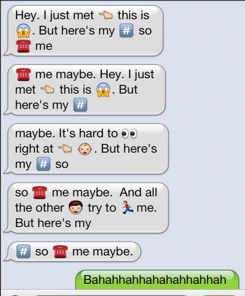 This is basically the last time you’ve seen a song so organically pop in a wholesome way and OH IT POPPED. It was on repeat for the last two months of my junior year and most of that summer. And ya know what? Can’t deny that it still slaps just as hard to this day. It’s so stupid, yet so adorbs. I have a crush, I like you, I’m gonna give you my number, Call me, MAYBE?! Ugh. I die for the nostalgia this song brings. Below is a real text I received on March 9, 2012 from my friend and not only does it solidify Call Me Maybe becoming a whole personality, but it also makes me want to ditch all of these terrible ios updates that just make us sound dumber in our texts and go back to the AIM style fonts and bubbles we started with. This was my very first iPhone and I miss that brick with a home button every damn day.