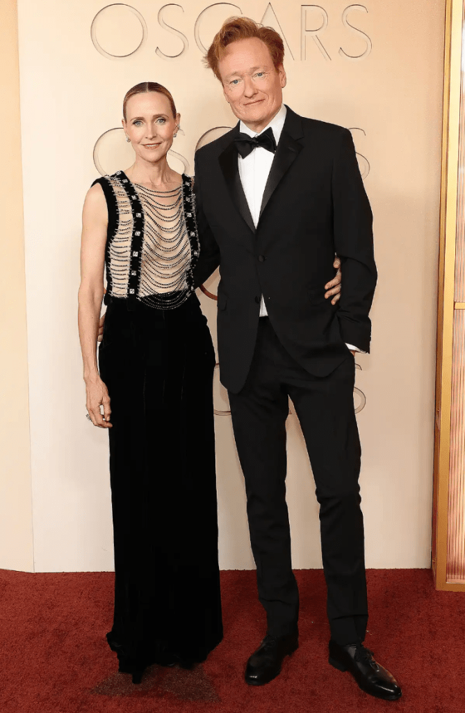 Should that affect how I judge his red carpet look? No, but I don’t follow the rules and that’s pretty obvious. You know what was funnier than any square, safe joke he told? His wife trying to steal the spotlight with this “chains and whips excite me” boobs out dress. Get it, grl.