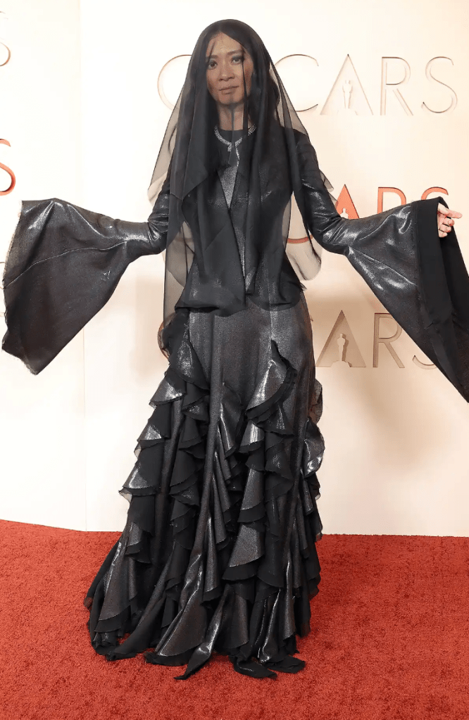 I’m noticing there’s a lot of black and white on the red carpet. What’s black and white and red all over? I don’t know but this gown look sloppy as hell. Ain’t doing her any favors.