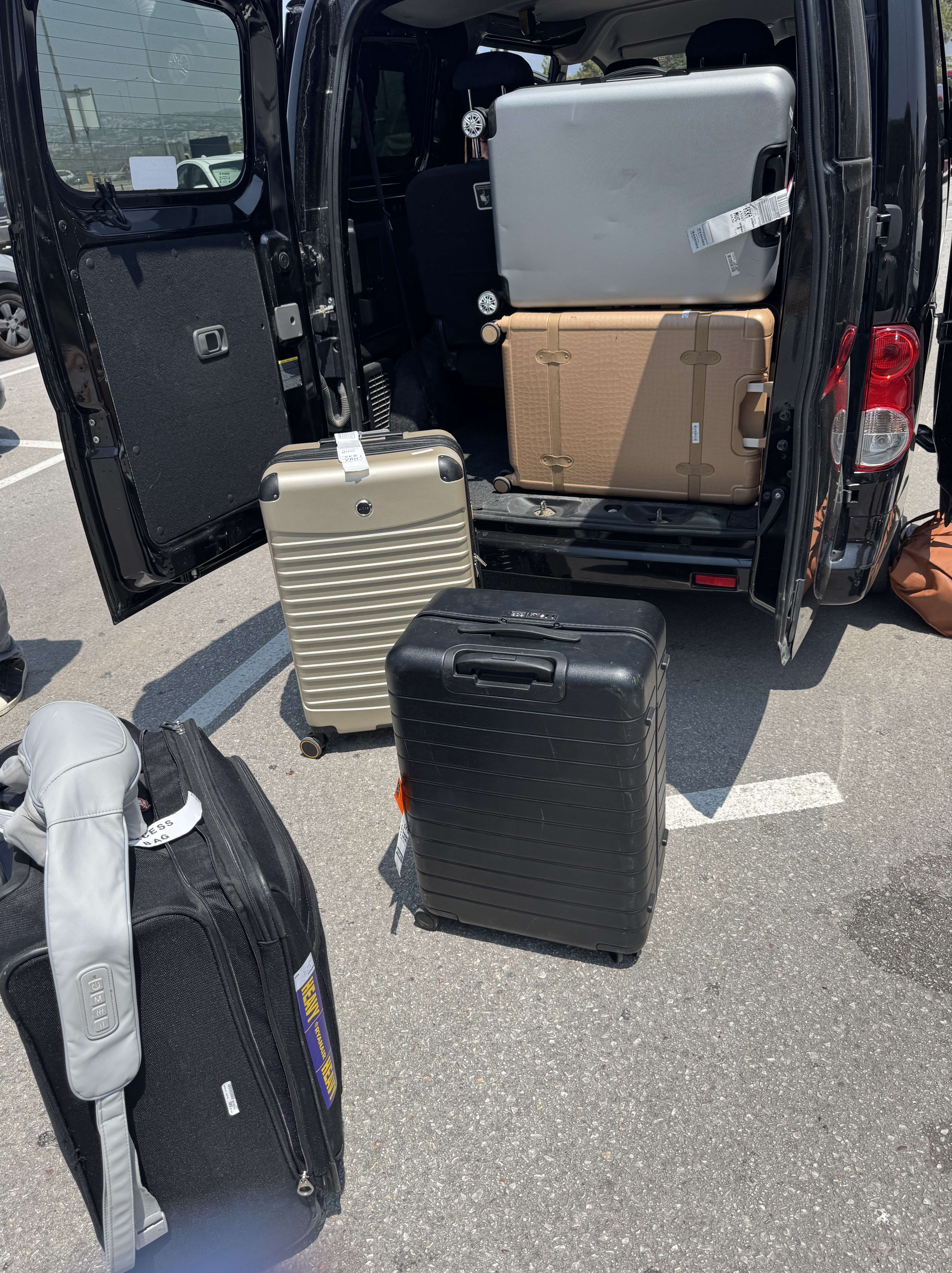 At this point Iโm loopy and I just have to laugh at the absurdity of not accounting for luggage with 6 women on a week-long trip, but also expecting jetlagged greasy babes to problem solve this pickle that we did not get ourselves into. As we stepped back and watched the chaos ensue, I learned via some side commentary that everyone was as concerned as I was about sending money to a stranger and receiving no details about this retreat in advance. So at least it was comforting to know that we were all duped as a unit. The final solution after 20-30 minutes of suitcase Jenga while we almost get hit by cars in the parking lot is two stacked in the trunk, two stacked in the front, and the remaining 20 bags to be shoved on laps and at feet throughout the van. We pile in and start rolling and immediately realize that the only source of airflow is in the front and being blocked by suitcases. We try to open windows and by pure luck, the one closest to me will not budge. Iโm in the back row of the van and I tell these girlies that Iโve met five minutes ago, โthis may be an opportune time to share that I get car sick, so I just wanted to give a headโs up that Iโll be closing my eyes and disassociating for the remainder of this three hour tour.โ Someone asked if I might throw up. Only time will tell, girlypops!