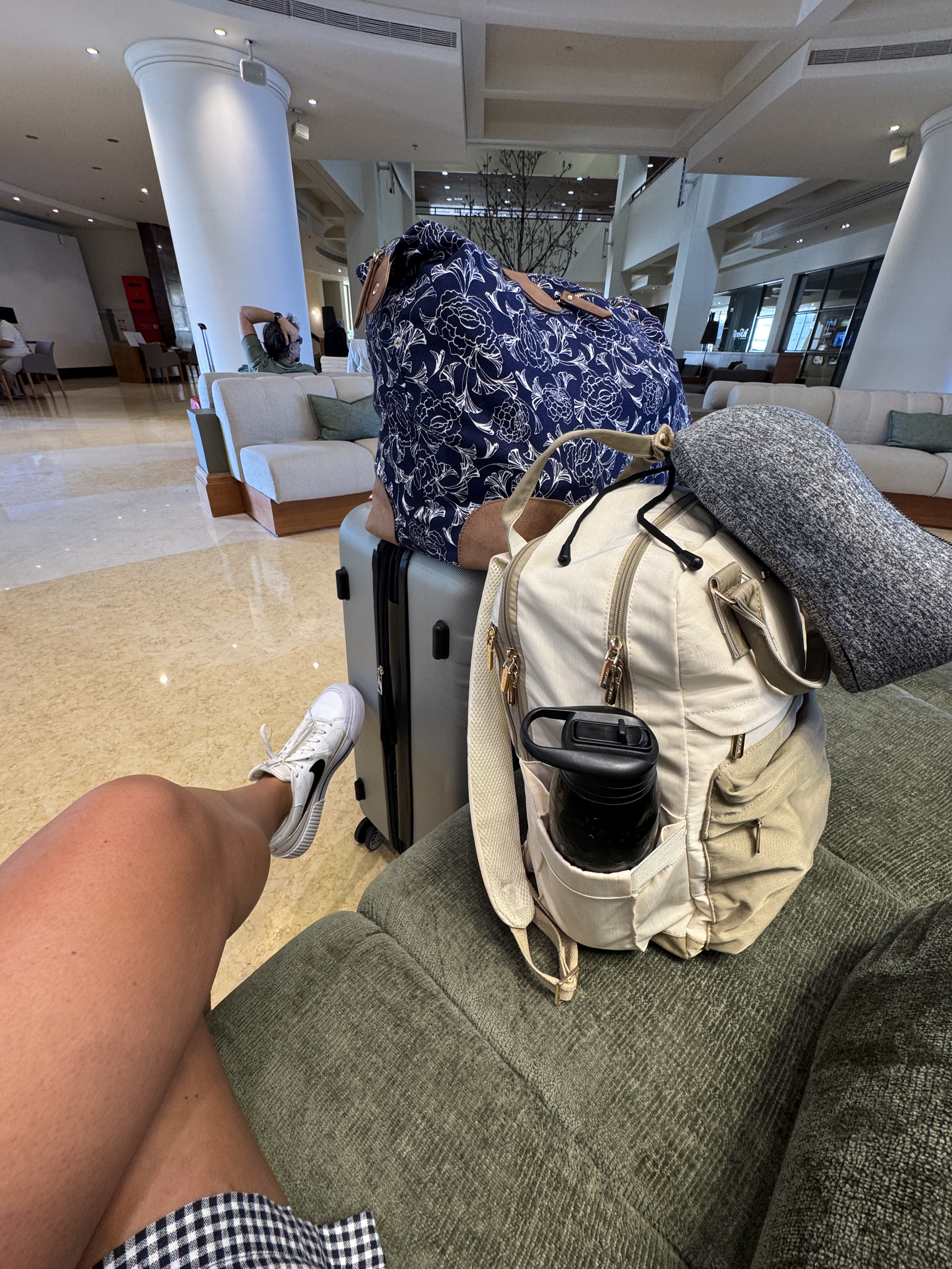 Well, I filled that bag right up (after two rounds of the luggage scale perp walk because I got the cranky airline employee who wanted to be a stickler for two pounds over) and had to schlep it through Newark airport. By the time I got to my gate to see if it existed, I had pit stains down to my ankles and full swass. I got a well-deserved $35 Ketel Soda to cool down and cry about the fact that I now was riddled with this American Eagle duffel bag overflowing with clothes and shoes for the rest of my 15 hour travel day. *Note: I wore everything I packed except for the rogue pair of jeans I threw in with several top variations for potentially cooler nights, which there were none of.ย So suck it, airport Judge Judy.