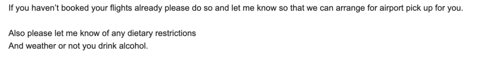 One month before we were due to be in Greece (my birthday), we receive an itinerary that is almost identical to the one I got in March, listing that we would be fed 3x a day, which SEEMS LIKE A GIVEN on a trip where three meals a day are included in the price. All of the girls were on this email, and if I really wanted to put on my detective hat, I couldโve pulled gov names from each email and looked them all up, but at this point I didnโt want to find any further damning information about this trip that I couldnโt back out of. We were 3 weeks out and I still had no clue what we were doing other than eating meals and going to a beach. The author followed up with an additional email saying “you’re probably wondering what to pack!” YA THINK? And said light clothes and comfy shoes. She also told us some tech items to include in our suitcases, including her favorite products, which she couldn’t remember the names of and couldn’t find on Amazon to link to. Both useless emails full of typos did nothing to give me more confidence about what was to come.
