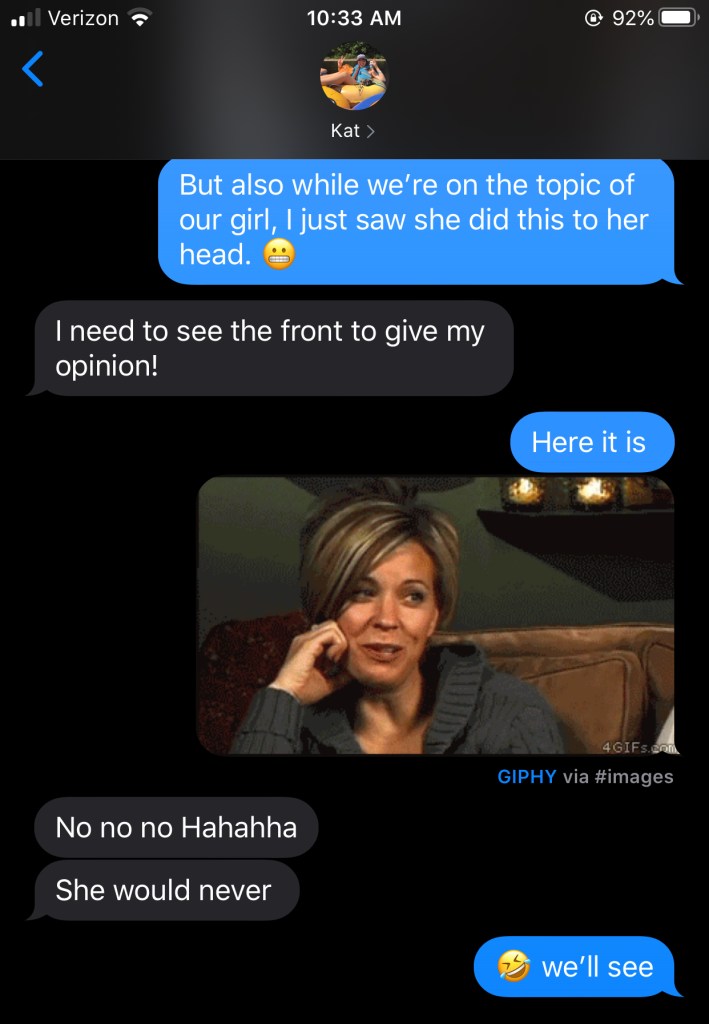 Credit to my friend Kat for giving her the benefit of the doubt and saying she’d need to see the front. But when you buzz the sides and leave the top long, there’s only one direction that heads in and that is Jon + Kate plus 8. Nope. Thankfully as soon as Kat saw the front shot she declared that she hated it. Can’t support our girl on this one. Lucky for rich people, they can ruin their entire head with a rash 2007 reality TV inspired ‘do and the next day will have a wig or weave in and a completely different color. Fingers crossed she comes to her senses.