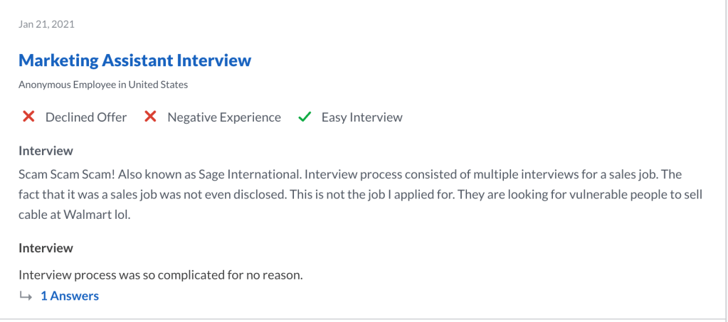 Then I kept reading because at this point I needed to get to the bottom of if I should axe this interview before it even happens. In their official company reviews, their score is 4.1 stars with a 75% chance they’d be recommended to a friend. I figured hm, it can’t be that bad if that’s their rating. I started reading some reviews. All of the reviews were written in the past month, some only a day apart and they all read EXACTLY the same way. A snappy title about how great the job is, a line about how long the “person” has been working there and then pros and cons. The con is always only ONE thing and it’s something about the company culture that they want to brag about and listed as a con in a funny way. Here are actual examples of cons in these SEVERAL VERY FAKE reviews: they need another Xbox in the lobby, we should have coffee and donuts every morning—not just on Fridays, needs another ping pong table, the chairs are too comfortable in the lobby, need another turtle for the tank, they left the office dog in the San Francisco branch. WHAT THE FUCK. Is the dog ok? Whose taking care of it? Will the turtle be affected by an extra Xbox using electricity too close to its tank? Why the hell is a company writing their own very obviously fake reviews to boost their score on Glassdoor? OH THAT’S RIGHT because if you scroll past all of this bullshit, you see three reviews of people who have actually worked here and they read like THIS: DO NOT WORK HERE! PYRAMID SCHEME! Fake job titles, nothing but a scam! They hire everyone to do the same thing, stand inside of a store and try to sell Xfinity packages.